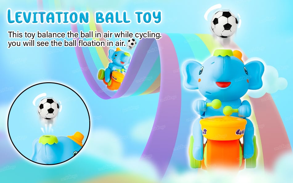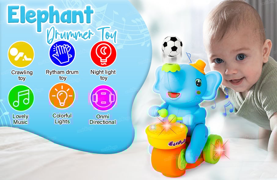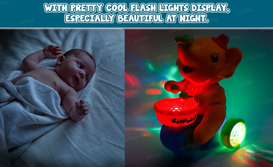 The Elephant Toy plays classic Drum as he unwinds and Shakes his Body to the rhythm, beating the drum joyfully with two hands. The lamplight is shining on the drum side and projected on the around . The toy turns around in circles.