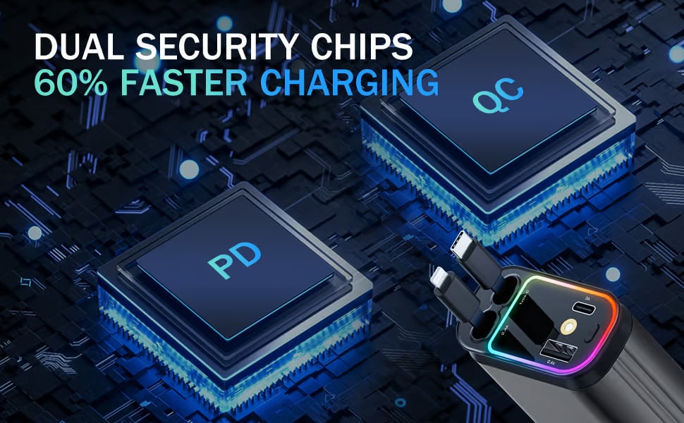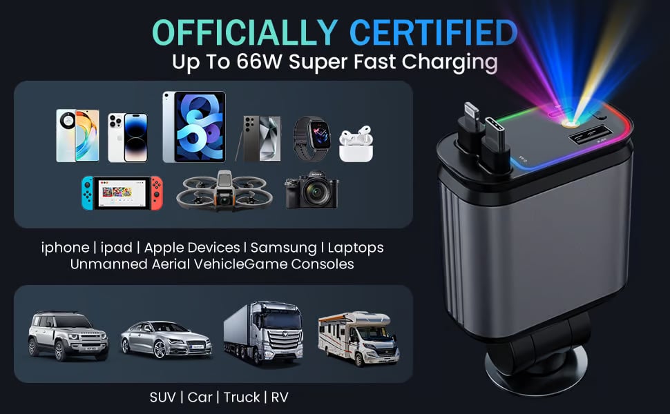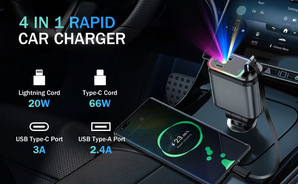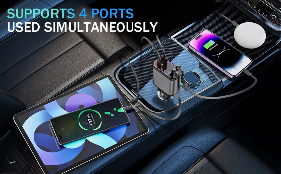 The 4-in-1 Fast Car Charger with two retractable cables (Type-C and IOS) and two additional ports (USB-C and USB-A), eliminating the hassle of carrying multiple cables and chargers. This car charger adapter allows for fast charging of up to four devices simultaneously, eliminating the need for multiple chargers and keeping your car clutter-free.