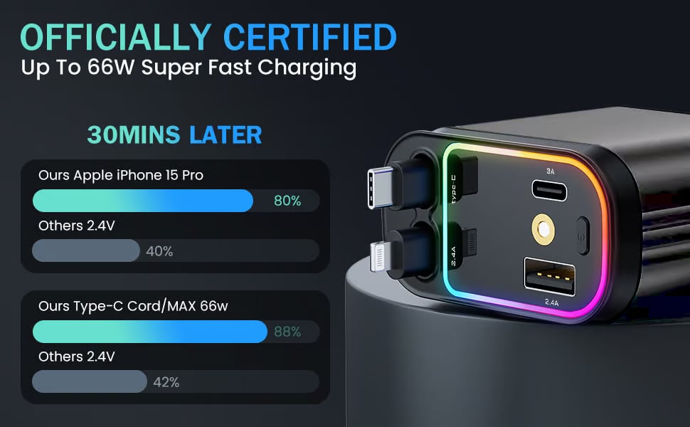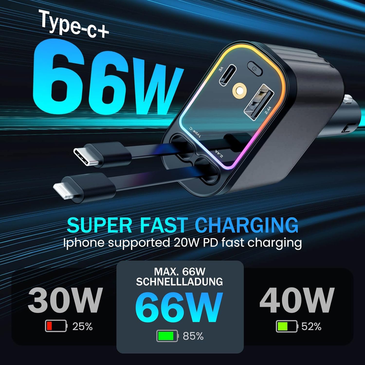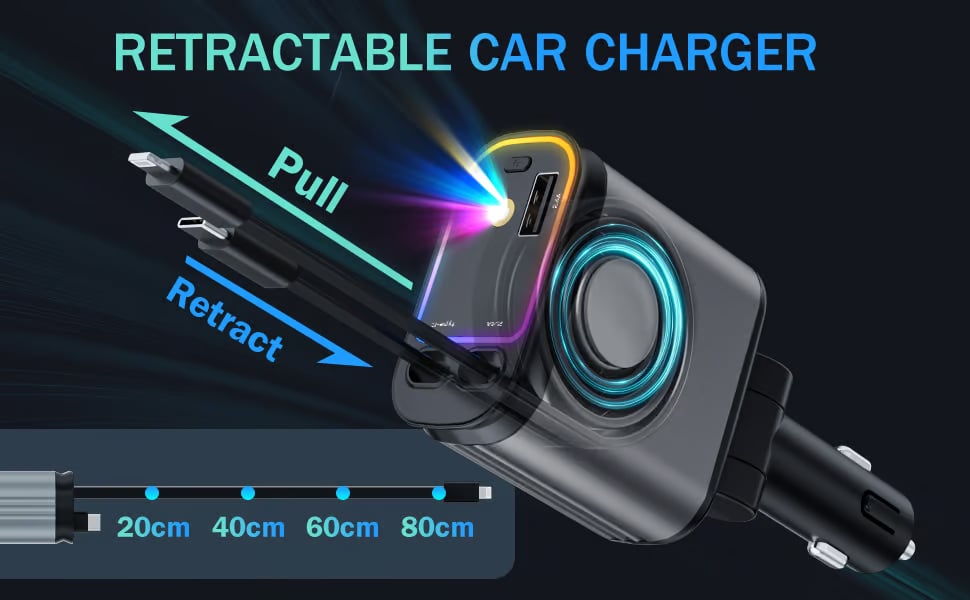 This Star Lights car phone charger comes with retractable Type-C and ios charging cables, each stretching up to 80cm (31.5 inches). Stretching for a short distance and then release to automatically bounce back to its original position. This design ensures that your car remains clutter-free and that the cables do not get tangled, providing a smooth and convenient charging experience.