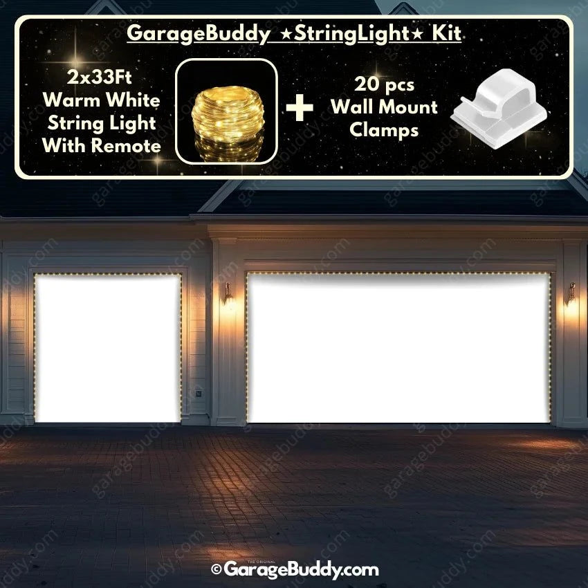 You now have an option to add the GarageBuddy string light kit to your order at 50% off and turn your garage into a true winter wonderland. The kit includes 1x 33 ft warm white string light, a remote control and 10x sticky wall mount clamps. The 2-door garage option comes with 2 string light kits. The lights work on three AA batteries (not included), so you don't need to run around finding electrical outlets.