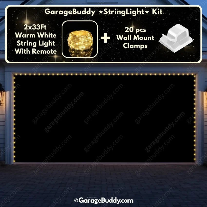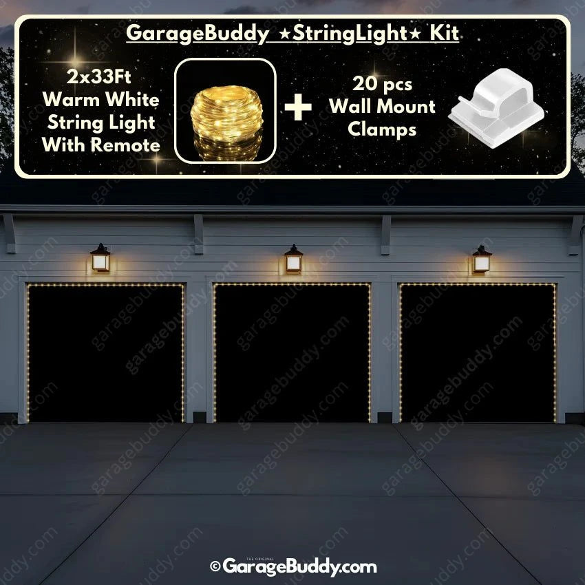 You now have the option to add the GarageBuddy string light kit to your order at 50% Off and turn your garage into a true show stopper. The kit includes 1x 33 ft warm white string light, a remote control, and 10x sticky wall mount clamps. The 2-door garage option comes with 2 string light kits. The lights work on three AA batteries (not included), so you don't need to run around finding electrical outlets.
