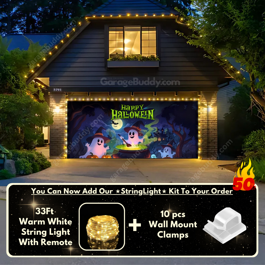 You now have the option to add the GarageBuddy string light kit to your order at 50% Off and turn your Halloween garage door cover into a true showstopper. The kit includes 1x 33 ft warm white string light, a remote control, and 10x sticky wall mount clamps. The 2-door garage option comes with 2 string light kits. The lights work on three AA batteries (not included), so you don’t need to run around finding electrical outlets.