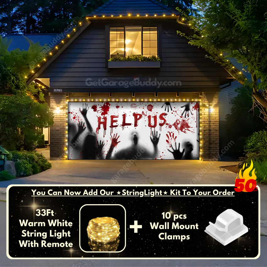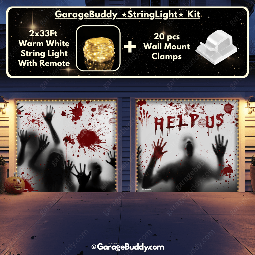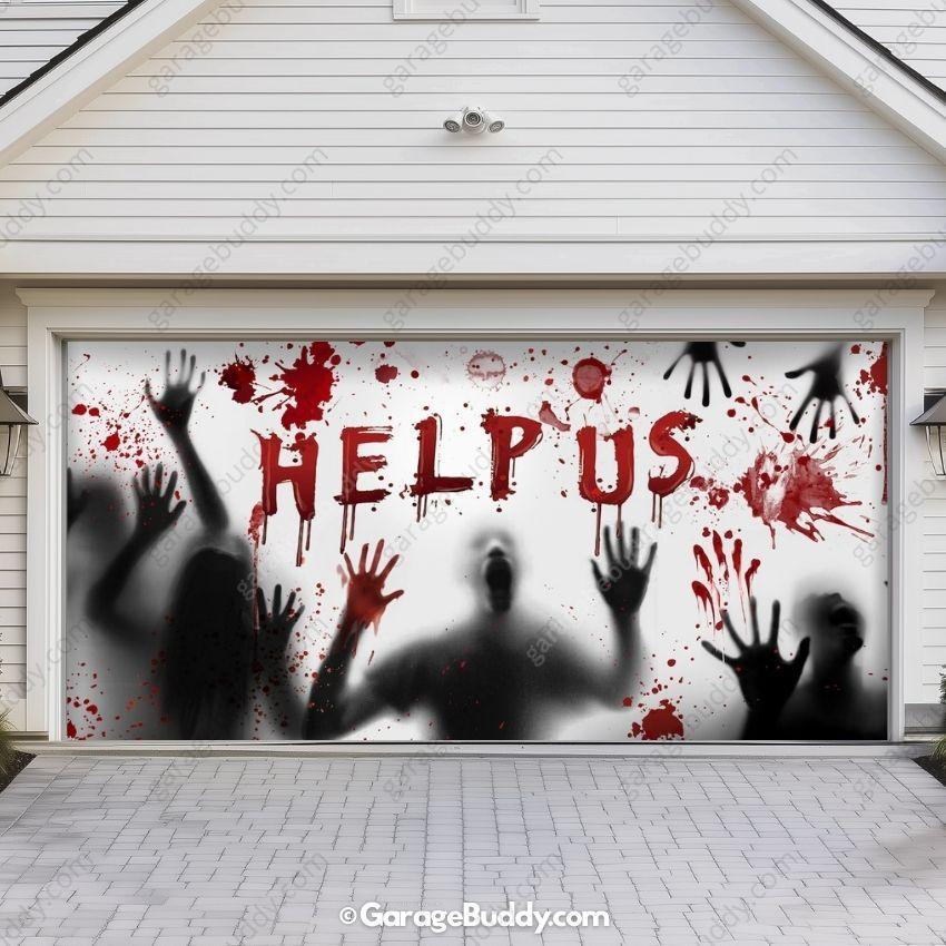 Create a chilling Halloween atmosphere with our Halloween garage door cover featuring shadows of trapped people. With eerie impressions of faces, hands, blood stains, and the haunting plea "Help Us" in blood red, this creepy garage door cover is designed to bring spine-chilling fright to your home.