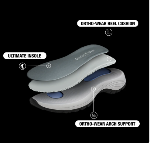 Ortho-Wear Premium Tech System: Our ergonomic cushioning sole reduces any impact that occurs after taking a step.