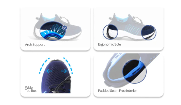 Anatomical Arch Support、Wide Toe-Box 、ORTHO-WEAR Heel Cushioning、Breathable Stretch Fit Material、Impact-AbsorbingSole