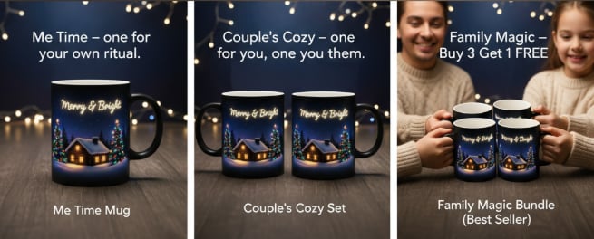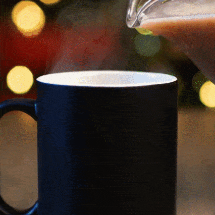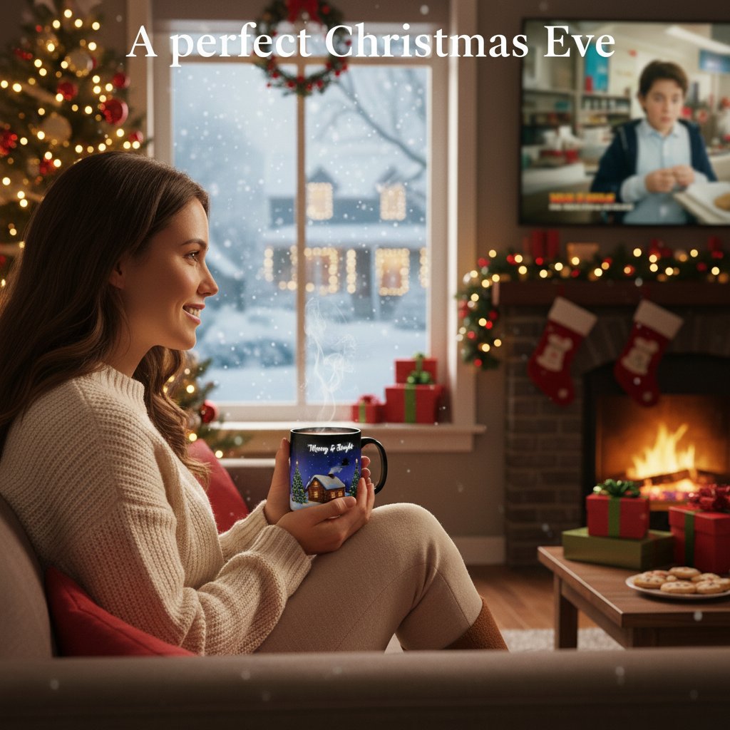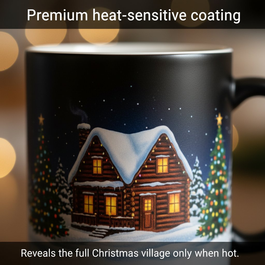 On the shelf, it looks like a sleek, matte dark mug with a calm, snowy “Silent Night” scene. But the moment you add something hot, it turns an ordinary cup of coffee into a tiny Christmas show