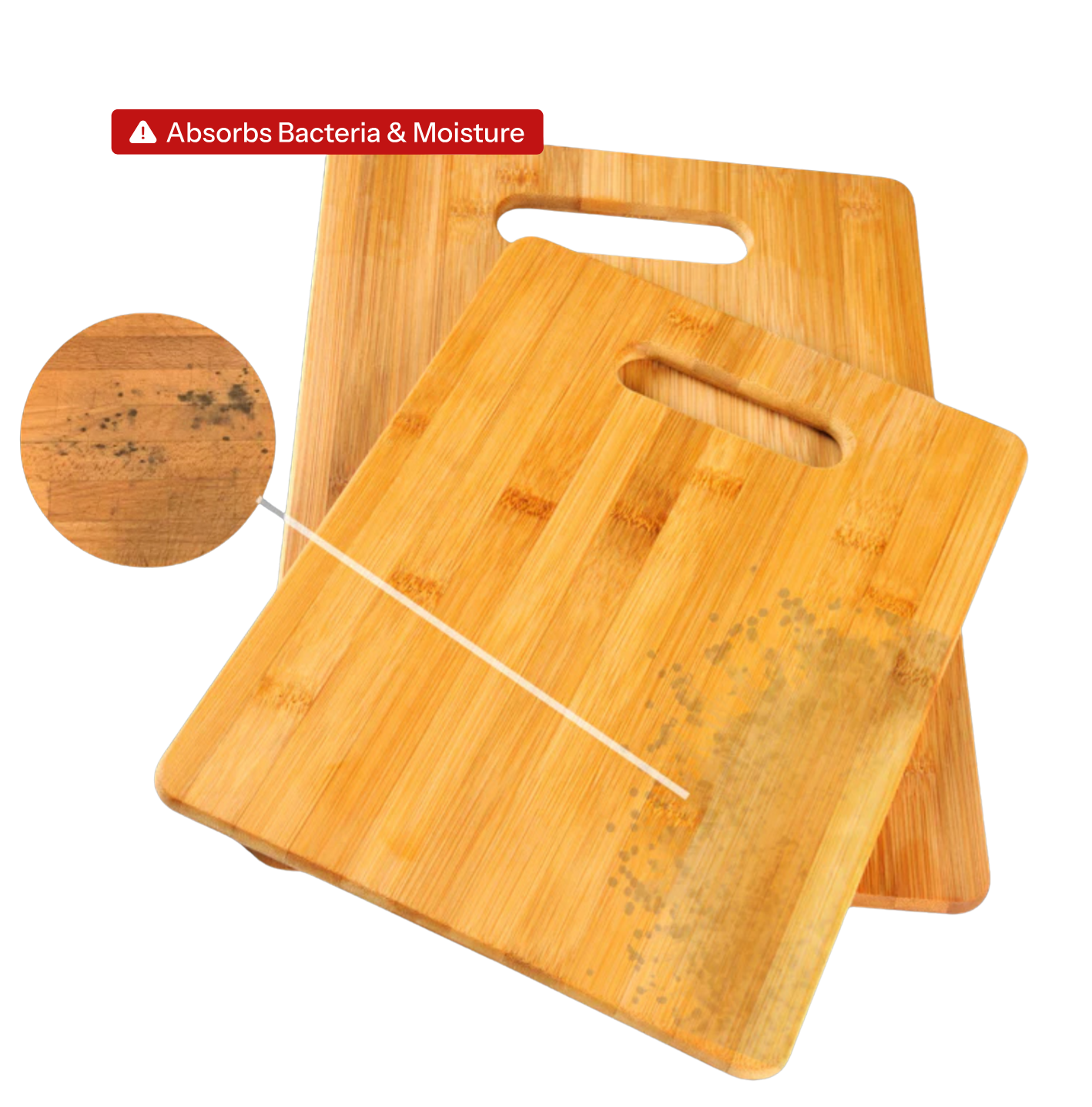 Wooden boards? They absorb moisture and trap bacteria deep inside cut grooves, making them impossible to fully sanitize without chemicals. lt's why most restaurants have banhed them Taima's Titanium Cutting Board is the only non-toxic, naturally antibacterial surface that doesn't release any chemicals. (lt will never shed toxins, soak up germs, grow mold or rust)