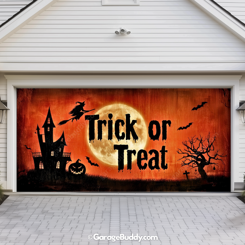 Whether you’re handing out candy or haunting the block, this eerie vintage Halloween garage door cover with its shadowy castle and flying witch tells every visitor: spooky season is officially on.