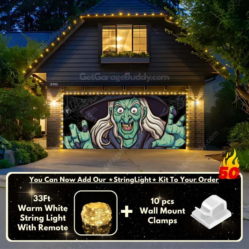 You now have the option to add the GarageBuddy string light kit to your order at 50% Off and turn your garage into a true showstopper. The kit includes 1x 33 ft warm white string light, a remote control, and 10x sticky wall mount clamps. The 2-door garage option comes with 2 string light kits. The lights work on three AA batteries (not included), so you don't need to run around finding electrical outlets. Combine them with your spooky garage door cover for the ultimate haunted display.