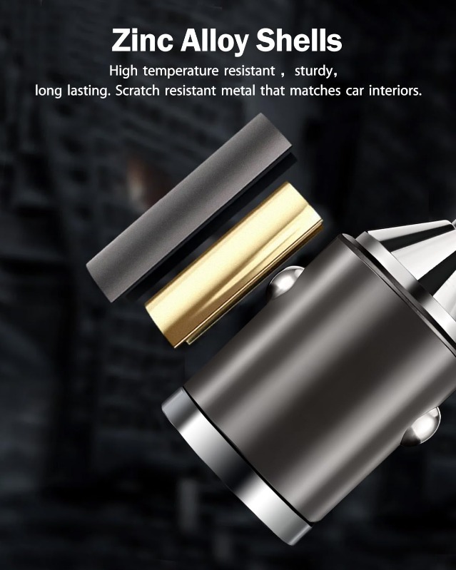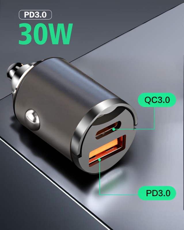 30W PD + 18W QC Mini Car Charger – Thumb-Sized Zinc Alloy USB-C & USB-A Adapter with LED Pull Ring