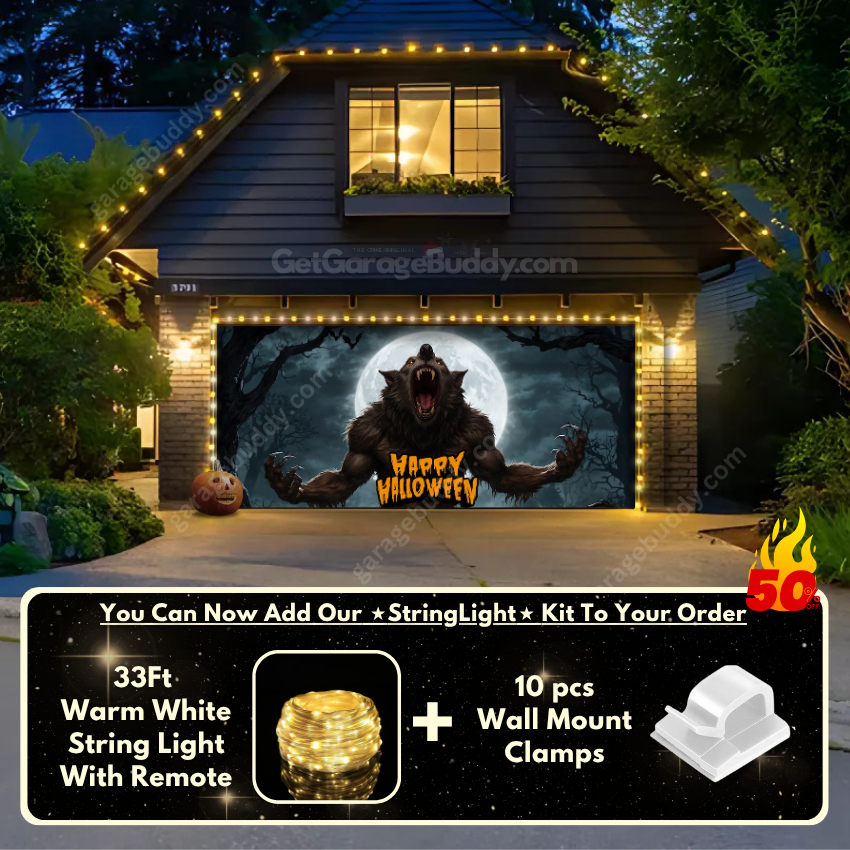 You now have the option to add the GarageBuddy string light kit to your order at 50% Off and turn your Halloween garage decoration into a true show stopper. The kit includes 1x 33 ft warm white string light, a remote control, and 10x sticky wall mount clamps. The 2-door garage option comes with 2 string light kits. The lights work on three AA batteries (not included), so you don’t need to run around finding electrical outlets. Combine them with your creepy garage door cover for the ultimate haunted house vibe.